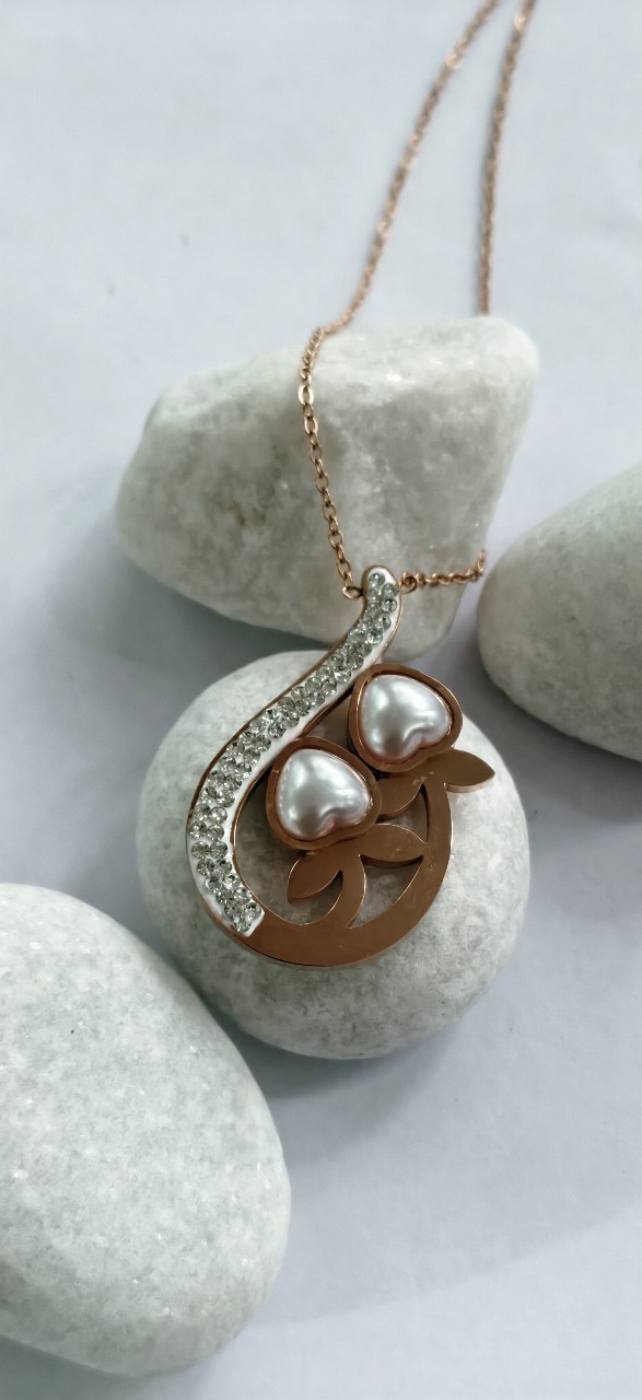 This elegant Fish Hook Stone Pendant Necklace features a unique design where the main body of the pendant is shaped like a stylized hook. The curved top section is brilliantly accented with a line of pavé-set white crystals. Nestled within the curve are two heart-shaped imitation pearls. The rest of the pendant is a rose gold-tone base, possibly forming a subtle piece of calligraphy or an abstract floral motif. It hangs from a delicate chain, offering a feminine and striking look.